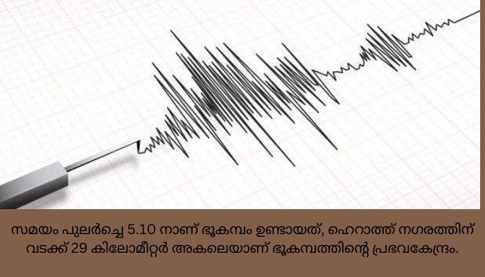അഫ്ഗാനിസ്ഥാൻ: പടിഞ്ഞാറൻ അഫ്ഗാനിസ്ഥാനിൽ വീണ്ടും ഭൂചനനം. 6.3 തീവ്രത രേഖപ്പെടുത്തിയ ഭൂചലനം അനുഭവപ്പെട്ടു. ഇതു വരെ ആളപായം ഒന്നും രേഖപ്പെടുത്തിയിട്ടില്ലെന്ന് യുണൈറ്റഡ് സ്റ്റേറ്റ്സ് ജിയോളജിക്കൽ സർവേ അറിയിച്ചു. സമയം പുലർച്ചെ 5.10 നാണ് ഭൂകമ്പം ഉണ്ടായത്, ഹെറാത്ത് നഗരത്തിന് വടക്ക് 29 കിലോമീറ്റർ അകലെയാണ് ഭൂകമ്പത്തിന്റെ പ്രഭവകേന്ദ്രം.