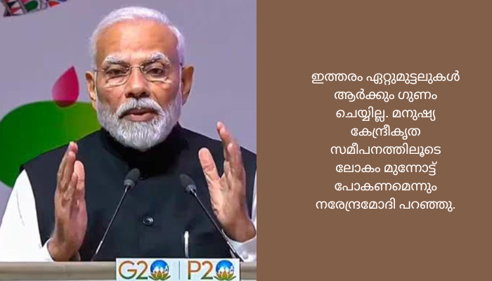 ജി 20 രാജ്യങ്ങളുടെ പാര്ലമെന്ററി സ്പീക്കര്മാരുടെ ഉച്ചകോടി ഉദ്ഘാടനം ചെയ്തു സംസാരിക്കുകയായിരുന്നു പ്രധാനമന്ത്രി. എന്തു കാരണം കൊണ്ട് രൂപമെടുക്കുന്നതായാലും, ഭീകരവാദം മാനവികതയ്ക്കെതിരാണ്. ഇതിനെതിരെ ഒരുമിച്ച് നടന്ന് മുന്നോട്ട് പോകാനുള്ള സമയമാണിതെന്നും പ്രധാനമന്ത്രി പറഞ്ഞു.