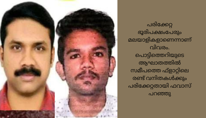 കണ്ണൂര് തലശ്ശേരി പുന്നോല് സ്വദേശികളായ ഷാനില്, നഹീല് എന്നിവരെയാണ് ഗുരുതരപരിക്കുകളോടെ ദുബായ് റാശിദ് ആശുപത്രിയില് പ്രവേശിപ്പിച്ചത്. മൂന്നുമുറികളിലായി 17 പേരാണ് ഫ്ളാറ്റില് താമസിച്ചിരുന്നത്.