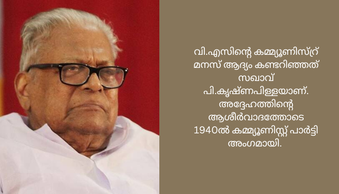 നിവർത്തന പ്രക്ഷോഭം ആളിക്കത്തിയപ്പോൾ അതിൽ നിന്ന് ഊർജ്ജമുൾക്കൊണ്ട് വി.എസ് സ്റ്റേറ്റ് കോൺഗ്രസിൽ അംഗമായി. ട്രേഡ് യൂണിയൻ രംഗത്തും സജീവമായി. വി.എസിന്റെ കമ്മ്യൂണിസ്റ്ര് മനസ് ആദ്യം കണ്ടറിഞ്ഞത് സഖാവ് പി.കൃഷ്ണപിള്ളയാണ്. അദ്ദേഹത്തിന്റെ ആശീർവാദത്തോടെ 1940ൽ കമ്മ്യൂണിസ്റ്റ് പാർട്ടി അംഗമായി. സഖാവിന്റെ നിർദ്ദേശപ്രകാരം കുട്ടനാട്ടിലെ കർഷക തൊഴിലാളികളെ സംഘടിപ്പിക്കാൻ നിയോഗിക്കപ്പെട്ടു. പുന്നപ്രവയലാർ സമരത്തെ തുടർന്ന് ഒളിവിൽ പോയ വി.എസിനെ പൂഞ്ഞാറിൽ വച്ച് പൊലീസ് അറസ്റ്റ് ചെയ്തു. ലോക്കപ്പിൽ കൊടിയ മർദ്ദനം. നാല് വർഷത്തോളം പൂജപ്പുര സെൻട്രൽ ജയിലിൽ. ലോക്കപ്പിൽ വച്ച് പൊലീസുകാർ ബയണറ്റ് കുത്തിയിറക്കിയ മുറിപ്പാട് ഇപ്പോഴും വി.എസിന്റെ കാലിലുണ്ട്. ത്യാഗത്തിന്റെയും ധീരതയുടെയും അടയാളമായി.തന്റെ ശൈലിയിലേക്കും കാഴ്ചപ്പാടുകളിലേക്കും സാധാരണക്കാരെ കൂട്ടിക്കൊണ്ടുവന്നതാണ് വി.എസിന്റെ മഹത്വം. അഴിമതിക്കെതിരെ വിട്ടുവീഴ്ച ഇല്ലാതെ പോരാടിയ വി.എസാണ് പരിസ്ഥിതി സംരക്ഷണം രാഷ്ട്രീയ അജണ്ടയാക്കിതും