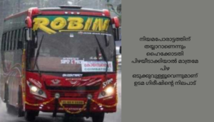 റോബിൻ ബസ് ഇന്നലെ കോയമ്പത്തൂരിലേക്കുള്ള സർവീസ് തുടങ്ങിയശേഷം നാലു തവണയാണ് എംവിഡി തടഞ്ഞത്. കേരളത്തിൽ 37,000 രൂപയും തമിഴ്നാട്ടിൽ 70,410 രൂപയും പിഴ ലഭിച്ചിരുന്നു. നിയമപോരാട്ടത്തിന് തയ്യാറാണെന്നും ഹൈക്കോടതി പിഴയീടാക്കിയാൽ മാത്രമേ പിഴ ഒടുക്കുവുള്ളൂവെന്നുമാണ് ഉടമ ഗിരീഷിന്റെ നിലപാട്.
