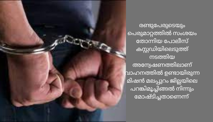 കുന്നംകുളം :മോഷ്ടിച്ചു കടത്തുന്ന കരിബിൻ ജ്യൂസ് മെഷീനുമായി രണ്ടുപേർ കുന്നംകുളം പോലീസിന്റെ പിടിയിൽ.വ്യാഴാഴ്ച രാത്രി പെട്രോളിന് ഇടയിൽ തുരുത്തിക്കാട് വെച്ച് പിക്കപ്പിൽ കടത്തിക്കൊണ്ടുപോകുന്ന കരിമ്പിൻ ജ്യൂസ് മെഷീൻ കണ്ട് സംശയം തോന്നി വാഹനത്തിൽ ഉണ്ടായിരുന്നവരെ ചോദ്യം ചെയ്യുകയായിരുന്നു. വാഹനത്തിൽ ഉണ്ടായിരുന്ന രണ്ടുപേരുടെയും പെരുമാറ്റത്തിൽ സംശയം തോന്നിയ പോലീസ് കസ്റ്റഡിയിലെടുത്ത് നടത്തിയ അന്വേഷണത്തിലാണ് വാഹനത്തിൽ ഉണ്ടായിരുന്ന മിഷൻ മലപ്പുറം ജില്ലയിലെ പറങ്കിമൂച്ചിങ്ങൽ നിന്നും മോഷ്ടിച്ചതാണെന്ന് കണ്ടെത്തിയത്.വാഴക്കാട് കുമ്പിടി വീട്ടിൽ അബ്ദുൽ ഗഫൂർ,വരവൂർ ചാത്തൻകുട്ടിൽ വീട്ടിൽ ഉമ്മർ എന്നിവരാണ് പോലീസിന്റെ പിടിയിലായത്. ജില്ലയിൽ അകത്തും പുറത്തുമായി ആറോളം കേസുകളിൽ പ്രതിയാണ് ഇവർ. കുന്നംകുളത്ത് റോഡ് സൈഡിൽ നിർത്തിയിട്ട ഓട്ടോ പൊളിച്ചു മാറ്റി വിറ്റ് കേസിൽ അറസ്റ്റിലായിരുന്ന ഇരുവരും ഈ ഇടയാണ് പുറത്തിറങ്ങിയത്.അറസ്റ്റ് രേഖപ്പെടുത്തിയ ശേഷം പ്രതികളെ കുന്നംകുളത്തെ താലൂക്ക് ആശുപത്രിയിൽ എത്തിച്ച് വൈദ്യ പരിശോധന നടത്തി.