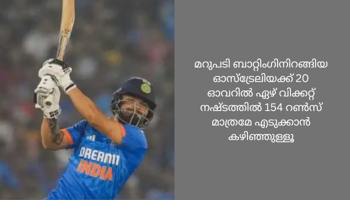 റായ്പൂരിൽ ഇന്ന് നടന്ന നാലാം ടി20യില് ആദ്യം ബാറ്റ് ചെയ്ത ഇന്ത്യ 9 വിക്കറ്റ് നഷ്ടത്തിൽ 174 റണ്സാണ് എടുത്തത്.മറുപടി ബാറ്റിംഗിനിറങ്ങിയ ഓസ്ട്രേലിയക്ക് 20 ഓവറിൽ ഏഴ് വിക്കറ്റ് നഷ്ടത്തിൽ 154 റൺസ് മാത്രമേ എടുക്കാൻ കഴിഞ്ഞുള്ളൂ.