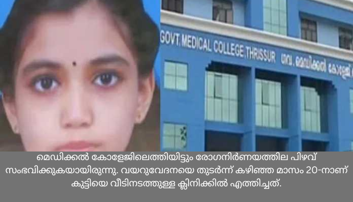 ഇതോടെ കുട്ടിയെ തൃശൂർ മെഡിക്കൽ കോളേജിലെത്തിച്ചു. സ്കാനിംഗും മറ്റ് പരിശോധനകളും നടത്തിയെങ്കിലും കുഴപ്പങ്ങളില്ലെന്ന് പറഞ്ഞ് ആശുപത്രിയിൽ നിന്നും മടക്കി അയച്ചു. വീട്ടിലെത്തിയ കുട്ടി കഴിഞ്ഞ 26-ന് ഛർദ്ദിച്ച് അവശയായി. തുടർന്ന് കുട്ടിയെ സ്വകര്യ ആശുപത്രിയിലെത്തിച്ചെങ്കിലും മരണം സംഭവിക്കുകയായിരുന്നു.