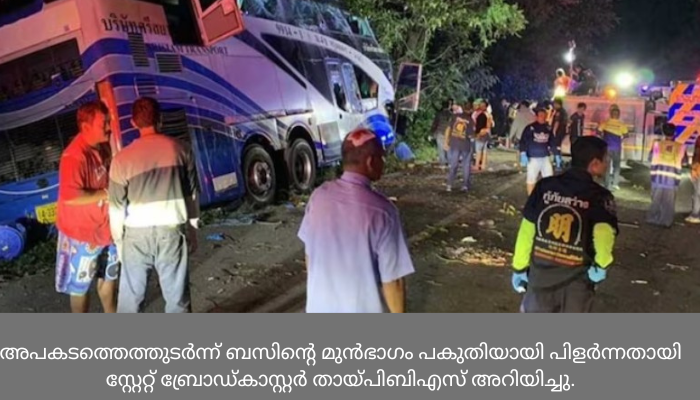 പടിഞ്ഞാറൻ പ്രവിശ്യയായ പ്രചുവാപ് ഖിരി ഖാനിൽ അർദ്ധരാത്രി ഒന്നരയോടെയാണ് അപകടം. അപകടത്തെത്തുടർന്ന് ബസിന്റെ മുൻഭാഗം പകുതിയായി പിളർന്നതായി സ്റ്റേറ്റ് ബ്രോഡ്കാസ്റ്റർ തായ്പിബിഎസ് അറിയിച്ചു.