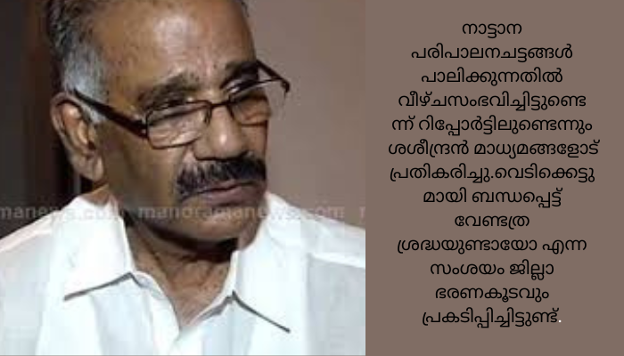 വളരെ ദാരുണവും നാടിനെ ഞെട്ടിച്ചതുമായ ദുരന്തമാണുണ്ടായത്. ബന്ധപ്പെട്ടവരുടെ റിപ്പോര്ട്ട് ലഭിച്ചിട്ടുണ്ട്. നാട്ടാന പരിപാലനചട്ടങ്ങള് പാലിക്കുന്നതില് വീഴ്ചസംഭവിച്ചിട്ടുണ്ടെന്ന് റിപ്പോര്ട്ടിലുണ്ടെന്നും ശശീന്ദ്രന് മാധ്യമങ്ങളോട് പ്രതികരിച്ചു.വെടിക്കെട്ടുമായി ബന്ധപ്പെട്ട് വേണ്ടത്ര ശ്രദ്ധയുണ്ടായോ എന്ന സംശയം ജില്ലാ ഭരണകൂടവും പ്രകടിപ്പിച്ചിട്ടുണ്ട്. ഇതിന്റെയെല്ലാം അടിസ്ഥാനത്തില് നിയമപരമായ നടപടി സ്വീകരിക്കും. വെടിക്കെട്ടുമായി ബന്ധപ്പെട്ട പ്രശ്നത്തില് ജില്ലാ മോണിറ്ററിങ് കമ്മിറ്റിയും പ്രത്യേകം പരിശോധന നടത്തേണ്ടതുണ്ട്. കാരണം, അവരാണ് എഴുന്നള്ളിപ്പിനുള്ള അന്തിമമായ അധികാരം നല്കേണ്ടത്.