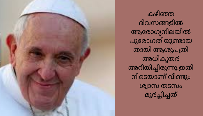 കഴിഞ്ഞ ദിവസങ്ങളില് ആരോഗ്യനിലയില് പുരോഗതിയുണ്ടായതായി ആശുപത്രി അധികൃതര് അറിയിച്ചിരുന്നു.ഇതിനിടെയാണ് വീണ്ടും ശ്വാസ തടസം മൂർച്ഛിച്ചത്. ശ്വാസകോശത്തില് കടുത്ത അണുബാധയുണ്ടായതിനെ തുടര്ന്നാണ് അദ്ദേഹത്തെ വെന്റിലേറ്ററില് പ്രവേശിപ്പിച്ചത്. 17 ദിവസമായി റോമിലെ ജെമെല്ലി ആശുപത്രിയിലാണ് മാര്പാപ്പ ചികിത്സയില് കഴിയുന്നത്..