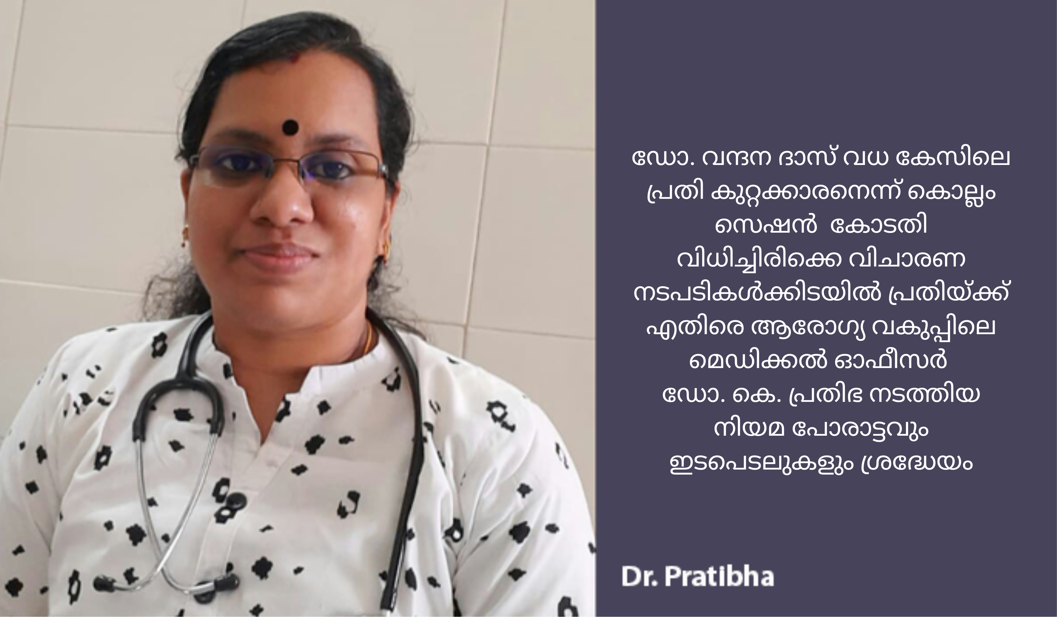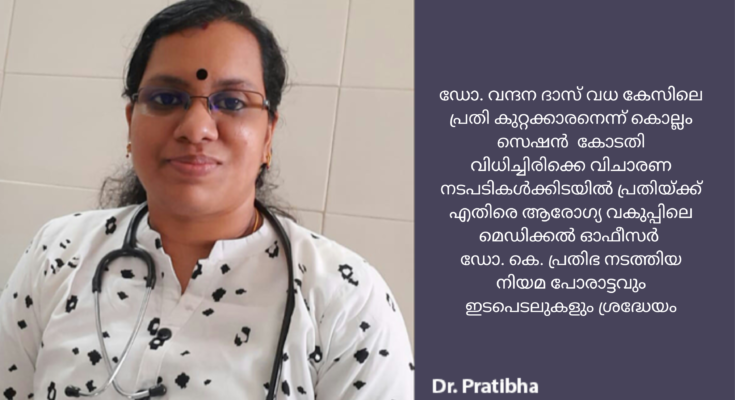 ഡോ. വന്ദന ദാസ് വധ കേസിലെ പ്രതി കുറ്റക്കാരനെന്ന് കൊല്ലം സെഷൻ കോടതി വിധിച്ചിരിക്കെ വിചാരണ നടപടികൾക്കിടയിൽ പ്രതിയ്ക്ക് എതിരെ ആരോഗ്യ വകുപ്പിലെ മെഡിക്കൽ ഓഫീസർ ഡോ. കെ. പ്രതിഭ നടത്തിയ നിയമ പോരാട്ടവും ഇടപെടലുകളും ശ്രദ്ധേയമായിരുന്നു. പ്രതി ഭാഗത്തിനായി വിചാരണയിൽ ഹാജരായികൊണ്ടിരുന്ന അഭിഭാഷകന് പിന്നാലെ എത്തി വക്കാലത്ത് എടുത്ത ഹൈക്കോടതി അഭിഭാഷകരായ രണ്ട് പേർ വിചാരണ വേളയുടെ വിവിധ ഘട്ടങ്ങളിൽ മരണപ്പെട്ടിരുന്നു. പ്രസ്തുത ഘട്ടത്തിൽ വിചാരണ നടപടികൾ തടസ്സപ്പെടുകയും നീട്ടിവയ്ക്കുകയും ചെയ്തു. തുടർന്ന് കോടതി നിശ്ചയിച്ച സമയങ്ങളിൽ അഭിഭാഷകനെ ഹാജരാക്കാൻ പ്രതി സമയം ചോദിക്കുന്നതല്ലാതെ പ്രതിയ്ക്കായി അഭിഭാഷകർ ഹാജരാകുന്നില്ല. ഇതിന്റെ അടിസ്ഥാനത്തിൽ വിചാരണ നീട്ടിക്കൊണ്ട് പോകാൻ പ്രതി ആസൂത്രിതമായി ശ്രമങ്ങൾ നടത്തുന്നത് പ്രോസിക്യൂഷനെ കൊണ്ട് എതിർക്കണമെന്ന് ആവിശ്യപ്പെട്ട് ഡോ. കെ. പ്രതിഭ സംസ്ഥാന പോലീസ് മേധാവിയെയും പ്രോസിക്യൂഷൻ ഡയറക്ടർ ജനറലിനെയും സമീപിച്ച് പ്രതിയ്ക്ക് എതിരെ പരാതി നൽകിയിരുന്നു. പ്രതിഭയുടെ പരാതിയിൽ തുടർ നടപടി സ്വീകരിക്കുവാൻ പ്രോസിക്യൂഷൻ ഡയറക്ടർ ജനറൽ കൊല്ലം ജില്ലാ പ്രോസിക്യൂഷന് നിർദ്ദേശം നൽകിയിരുന്നു. വിചാരണ തുടരവെ എത്തിയ മറ്റൊരു അഭിഭാഷകനും പ്രതിയുടെ വക്കാലത്ത് ഒഴിയുകയും പ്രതിഭാഗത്തിന് പുതിയ അഭിഭാഷകനെ ഹാജരാക്കുവാൻ കോടതി സമയം അനുവദിക്കുകയും വീണ്ടും വിചാരണ നീളുകയും ചില കാരണങ്ങളാൽ വിചാരണ തടസ്സപ്പെടുകയും ചെയ്തു. ഇത് സംബന്ധിച്ച് ഡോ. കെ. പ്രതിഭ ഹൈക്കോടതി രജിസ്ട്രാർ ജനറലിനെ സമീപിച്ച് പരാതി നൽകി പ്രതിയ്ക്ക് എതിരെ നിയമ പോരാട്ടം തുടർന്നു. ഡോ. കെ. പ്രതിഭയുടെ പരാതിയിൽ ഹൈക്കോടതി രജിസ്ട്രാർ ജനറൽ വിചാരണ കോടതിയോട് റിപ്പോർട്ട് തേടുകയും വിചാരണ നടപടികൾ പരിശോധിക്കുകയും ചെയ്തിരുന്നു. ഇതിന് ശേഷം വിചാരണ ഒരിക്കലും തടസ്സപ്പെടാത്തതും വേഗത്തിലായതും ശ്രദ്ധേയമാണ്. കൊട്ടാരക്കര താലൂക്ക് ആശുപത്രിയിൽ സന്ദീപിനെ ചികിത്സിക്കുവാൻ പോലീസ് എത്തിക്കവെ പോലീസ് മാറി നിന്നത് പ്രതികളുടെ വൈദ്യ പരിശോധന ഉത്തരവിലെ നിർദ്ദേശങ്ങളുടെ ഭാഗമായിരുന്നുവെന്ന പ്രചാരണവും വന്ദന ദാസിന്റെ മരണത്തിന്റെ മറവിൽ ഉണ്ടായി.