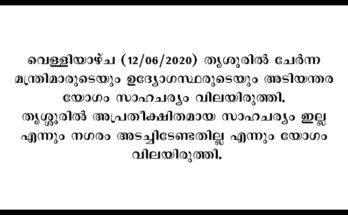 തൃശ്ശൂർ : ആരോഗ്യ പ്രവർത്തകർ, ചുമട്ടുതൊഴിലാളികൾ, ശുചീകരണ തൊഴിലാളികൾ എന്നീ വിഭാഗങ്ങളിൽ കൊറോണ രോഗ ബാധ സ്ഥിരീകരിച്ചതിനെ തുടർന്ന് ഇന്ന്, വെള്ളിയാഴ്ച (12/06/2020) തൃശൂരിൽ ചേർന്ന മന്ത്രിമാരുടെയും ഉദ്യോഗസ്ഥരുടെയും അടിയന്തര യോഗം സാഹചര്യം വിലയിരുത്തി. തൃശ്ശൂരിൽ അപ്രതീക്ഷിതമായ സാഹചര്യം ഇല്ല എന്നും …