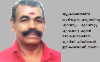 തൃശൂര്: നായയെ വളര്ത്തുന്നതു സംബന്ധിച്ച തര്ക്കത്തെ തുടർന്ന് സഹോദരന്റെ മകന്റെ കുത്തേറ്റ് ചികിത്സയിലിരുന്ന ഗൃഹനാഥന് മരിച്ചു. ക്രിസ്റ്റഫര് നഗര് സ്വദേശി ശശി (60) ആണ് 8-10 -2020 വ്യാഴാഴ്ച മരിച്ചത്. 29-9-2020 ന് നടക്കാനിറങ്ങിയ ശശിയെ ഇദ്ദേഹത്തിന്റെ സഹോദരന്റെ മകൻ അക്ഷയ് …
