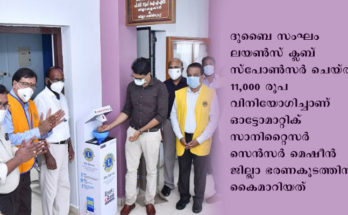 പത്തനംതിട്ട ദുബൈ സംഘം ലയണ്‍സ് ക്ലബ് അടൂര്‍ എമിറേറ്റ്സിന്റെ നേതൃത്വത്തില്‍ ഓട്ടോമാറ്റിക് സാനിറ്റൈസര്‍ സെന്‍സര്‍ മെഷീന്‍ കൈമാറി