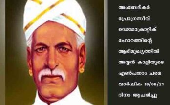 കോട്ടയം: അംബേദ്കര് പ്രോഗ്രസീവ് ഡെമോക്രാറ്റിക് ഫോറത്തിന്റെ ആഭിമുഖ്യത്തില് അയ്യന് കാളിയുടെ എണ്പതാം ചരമ വാര്ഷിക 18/06/21 ദിനം ആചരിച്ചു. കോവിഡിന്റെ പാശ്ചാത്തലത്തില് ഓണ് ലൈന് യോഗമാണ് നടന്നത്. പട്ടിക വിഭാഗ വിദ്യാര്ത്ഥികളുടെ ഓണ്ലൈന് പഠനം മുടങ്ങതെ തുടരുവാന് ആവശ്യമായ പഠനോപകരണങ്ങളും ,ഇതര …