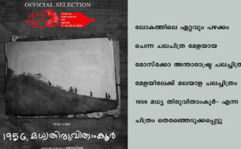 കൊച്ചി: ലോകത്തിലെ ഏറ്റവും പഴക്കം ചെന്ന ചലചിത്ര മേളയായ മോസ്ക്കോ അന്താരാഷ്ട്ര ചലച്ചിത്ര മേളയിലേക്ക് മലയാള ചലച്ചിത്രം -1956 മധ്യ തിരുവിതാംകൂര്‍- എന്ന ചിത്രം തെരഞ്ഞെടുക്കപ്പെട്ടു. ചലചിത്ര മേളയുടെ 42-മത്  അദ്ധ്യമാണ് നടക്കുന്നത്.  തന്‍റെ ചിത്രം മേളയിലേക്ക് തെരഞ്ഞെടുക്കപ്പെട്ടതില്‍ സന്തോഷമുണ്ടെന്ന്  ഡോണ്‍ പാലത്തറ  ഫേസ് ബുക്ക് പേജിലൂടെ …