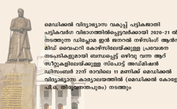 മെഡിക്കൽ വിദ്യാഭ്യാസ വകുപ്പ് പട്ടികജാതി പട്ടികവർഗ വിഭാഗത്തിൽപ്പെട്ടവർക്കായി 2020-21 ൽ നടത്തുന്ന ഡിപ്ലോമ ഇൻ ജനറൽ നഴ്സിംഗ് ആൻഡ് മിഡ് വൈഫറി കോഴ്സിലേയ്ക്കുള്ള പ്രവേശന നടപടികളുമായി ബന്ധപ്പെട്ട് ഒഴിവു വന്ന ആറ് സീറ്റുകളിലേയ്ക്കുള്ള സ്പോട്ട് അഡ്മിഷൻ ഡിസംബർ 22ന് രാവിലെ 11 …