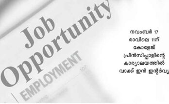 തൃപ്പൂണിത്തുറ ഗവൺമെന്റ് ആയുർവേദ കോളേജിൽ ക്രിയാശാരീരം, ആർ & ബി, ശല്യതന്ത്രം വിഭാഗങ്ങളിൽ അസിസ്റ്റന്റ് പ്രൊഫസർ തസ്തികയിൽ വാക്ക്-ഇൻ-ഇന്റർവ്യൂ നടത്തി ഒരു വർഷ കരാറിൽ നിയമിക്കുന്നതിന് അപേക്ഷ ക്ഷണിച്ചു.ആയുർവേദത്തിലെ ക്രിയാശാരീരം, ആർ & ബി, ശല്യതന്ത്രം എന്നീ വിഷയങ്ങളിൽ ബിരുദാനന്തര ബിരുദവും, …