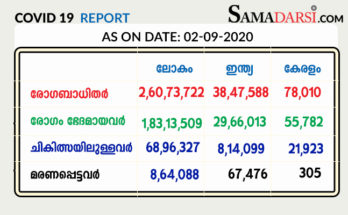 തിരുവനന്തപുരം: കേരളത്തില് ബുധനാഴ്ച (02/09/2020) 1547 പേര്ക്ക് കോവിഡ്-19 സ്ഥിരീകരിച്ചതായി ആരോഗ്യ വകുപ്പ് മന്ത്രി കെ. കെ. ശൈലജ ടീച്ചര് അറിയിച്ചു. തിരുവനന്തപുരം ജില്ലയില് നിന്നുള്ള 228 പേര്ക്കും, കോഴിക്കോട് ജില്ലയില് നിന്നുള്ള 204 പേര്ക്കും, ആലപ്പുഴ ജില്ലയില് നിന്നുള്ള 159 …