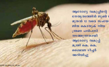 തിരുവനന്തപുരം: ഡെങ്കിപ്പനി പ്രതിരോധത്തിനും നിയന്ത്രണത്തിനുമായി ആരോഗ്യ വകുപ്പിന്റെ നേതൃത്വത്തില് ജൂണ് 8 മുതല് 12 വരെ സംയോജിത കൊതുക് നിയന്ത്രണ പരിപാടി നടത്തുന്നതായി ആരോഗ്യ വകുപ്പ് മന്ത്രി കെ. കെ. ശൈലജ ടീച്ചര് അറിയിച്ചു. കൊതുക് നശീകരണത്തിന് ഉറവിട നശീകരണം, രാസ-ജൈവ …