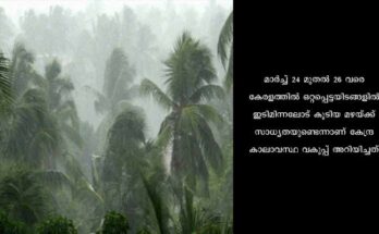 തിരുവനന്തപുരം: സംസ്ഥാനത്ത് 24/03/23 വെള്ളിയാഴ്ച മുതൽ അടുത്ത അഞ്ച് ദിവസം ഇടിമിന്നലോട് കൂടിയ മഴയ്ക്ക് സാധ്യതയെന്ന് കേന്ദ്ര കാലാവസ്ഥ വകുപ്പ്. മാർച്ച് 24 മുതൽ 26 വരെ കേരളത്തിൽ ഒറ്റപ്പെട്ടയിടങ്ങളിൽ ഇടിമിന്നലോട് കൂടിയ മഴയ്ക്ക് സാധ്യതയുണ്ടെന്നാണ് കേന്ദ്ര കാലാവസ്ഥ വകുപ്പ് അറിയിച്ചത്. …