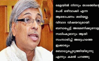 നടൻ സലിംകുമാറിനെ അന്താരാഷ്ട്ര ചലച്ചിത്ര മേളയിൽ നിന്നും ഒഴിവാക്കിയിട്ടില്ലെന്നും സലീം കുമാറിനെ വാദങ്ങൾ ശരിയല്ലെന്നും, വിവാദമുണ്ടാക്കിയതിന് പിന്നിൽ രാഷ്ട്രീയ ലക്ഷ്യങ്ങൾ ആകാമെന്നും എന്നും അന്താരാഷ്ട്ര ചലച്ചിത്ര അക്കാദമി ചെയർമാൻ കമൽ പറഞ്ഞു. മേളയിൽ നിന്നും താരത്തിന്റെ പേര് ഒഴിവാക്കി എന്ന ആരോപണം …