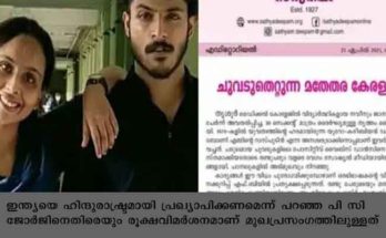 പിസി ജോര്‍ജിന്റെ ഹിന്ദുരാഷ്ട്ര പ്രസ്താവനയ്ക്കെതിരെ സത്യദീപം മുഖ പ്രസംഗം ‘നവീനും ജാനകിക്കും പിന്തുണ’ Read More