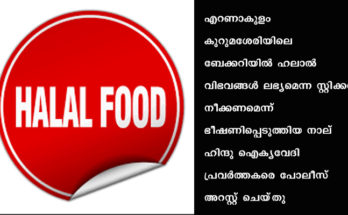 കൊച്ചി: എറണാകുളം കുറുമശേരിയിലെ ബേക്കറിയില് ഹലാല് വിഭവങ്ങള് ലഭ്യമെന്ന സ്റ്റിക്ക൪ നീക്കണമെന്ന് ഭീഷണിപ്പെടുത്തിയ നാല് ഹിന്ദു ഐക്യവേദി പ്രവര്ത്തകരെ പോലീസ് അറസ്റ്റ് ചെയ്തു. ഹിന്ദു ഐക്യവേദി പാറക്കടവ് പഞ്ചായത്ത് സമിതി പ്രസിഡന്റ് അരുണ് അരവിന്ദ്, ജന. സെക്രട്ടറി ധനേഷ് പ്രഭാകരന് എന്നിവരേയും …