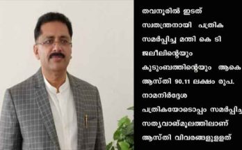 കെ ടി ജലീലിന്റെ ആസ്തി 90.11 ലക്ഷം രൂപ Read More