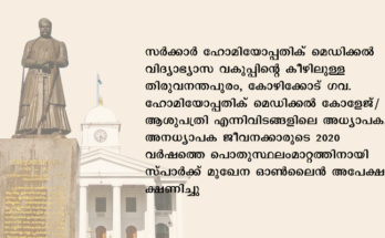 സർക്കാർ ഹോമിയോപ്പതിക് മെഡിക്കൽ വിദ്യാഭ്യാസ വകുപ്പിന്റെ കീഴിലുള്ള തിരുവനന്തപുരം, കോഴിക്കോട് ഗവ. ഹോമിയോപ്പതിക് മെഡിക്കൽ കോളേജ്/ ആശുപത്രി എന്നിവിടങ്ങളിലെ അധ്യാപക, അനധ്യാപക ജീവനക്കാരുടെ 2020 വർഷത്തെ പൊതുസ്ഥലംമാറ്റത്തിനായി സ്പാർക്ക് മുഖേന ഓൺലൈൻ അപേക്ഷ ക്ഷണിച്ചു. ജീവനക്കാർക്ക് നേരിട്ട് ഓൺലൈൻ അപേക്ഷ ഡിസംബർ …