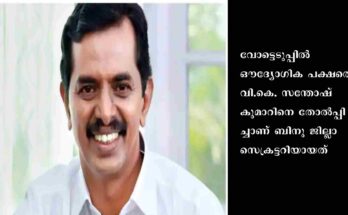 കോട്ടയം: സിപിഐ കോട്ടയം ജില്ലാ സെക്രട്ടറിയായി വി.ബി. ബിനു തിരഞ്ഞെടുക്കപ്പെട്ടു. വോട്ടെടുപ്പിൽ ഔദ്യോഗിക പക്ഷത്തെ വി.കെ. സന്തോഷ് കുമാറിനെ തോൽപ്പിച്ചാണ് ബിനു ജില്ലാ സെക്രട്ടറിയായത്. കെ ഇ ഇസ്മയിൽ പക്ഷക്കാരനാണ് ബിനു. 8 വോട്ടുകൾക്കാണ് ബിനുവിന്റെ വിജയം. ജില്ലാ സെക്രട്ടറി സ്ഥാനത്തേക്ക് …